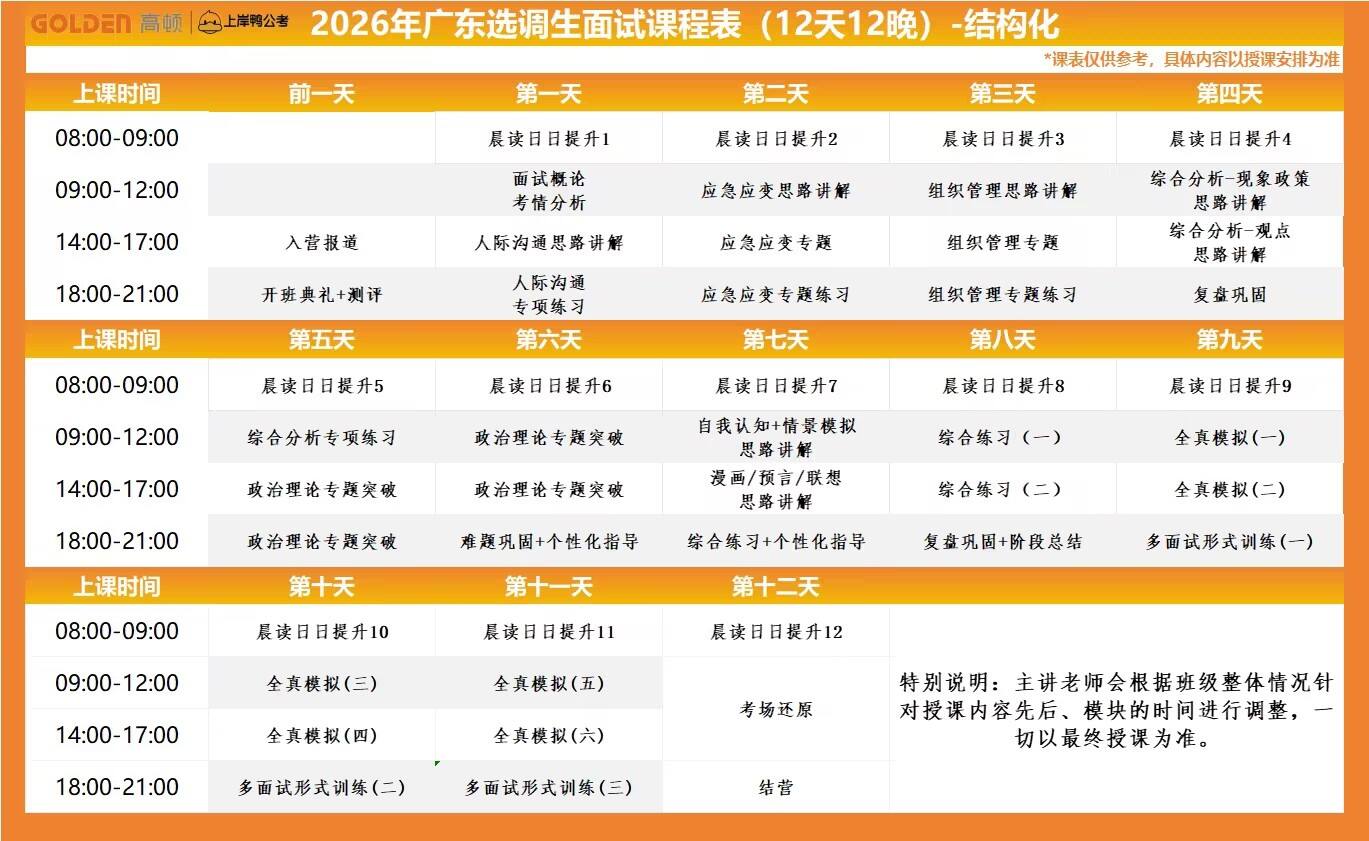 高顿上岸鸭公考现推出2026广东选调生面试班,12天12晚、9天9晚,精英本土师资,12人封班主讲师资带练,有意向的小伙伴可点击右下角对话框进行咨询。