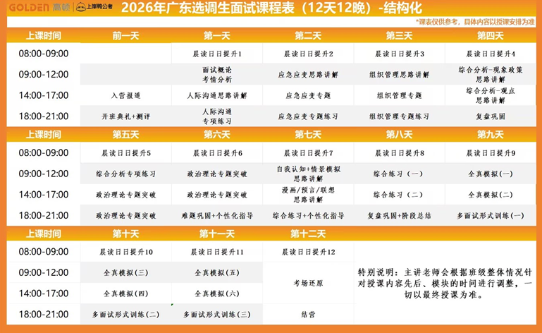 2026年广东选调生笔试成绩已出,面试将在3月6日举行,采取结构化面试方式进行。高顿上岸鸭公考现推出2026广东选调生面试班,精英本土师资,12人小班主讲师资带练,学至考前,以下是详细内容。