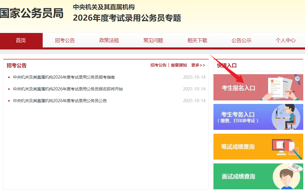 考生登录国家公务员局中央机关及其直属机构2026年度考录公务员专题,点击考生报名入口即可进入报名页面,报名时间为10月15日8:00至10月24日18:00。