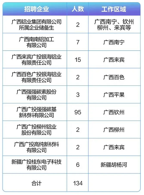 广西铝业集团2026年春季校园招聘公告已经正式发布了,主要面向2026届以及往届离校未就业毕业生,一共招聘134人,主要招聘材料冶金、机械电子、电气自动化、智能制造等等专业,具体内容整理如下: