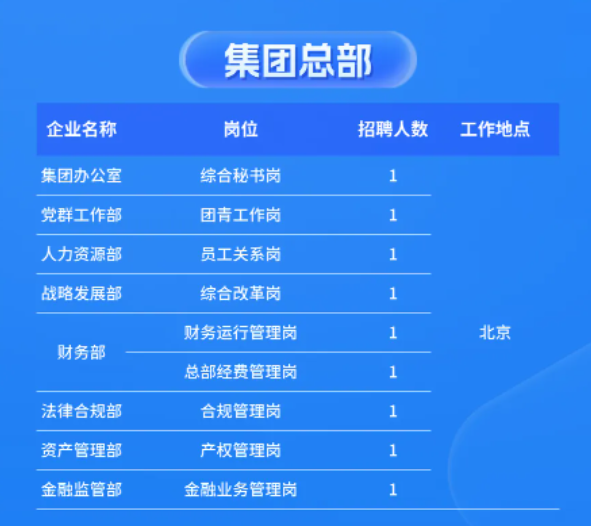 职工待遇:六险二金、定期体检、专业化培养、轮岗交流、具有竞争力的市场化薪酬、员工餐厅、节日福利、补贴津贴、为优秀毕业生解决北京落户、生日福利