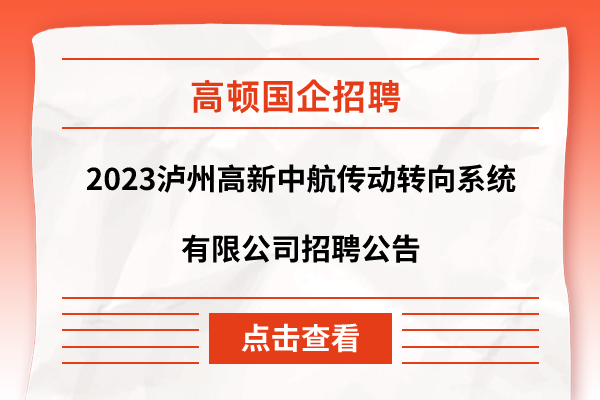 泸州高新中航传动转向系统有限公司成立于2016年11月,是泸州市高新投资集团有限公司(市属国有企业)控股子公司。根据公司业务发展需要,诚邀社会各方优秀人才加入,报名时间:即日起至2023年12月30日。...