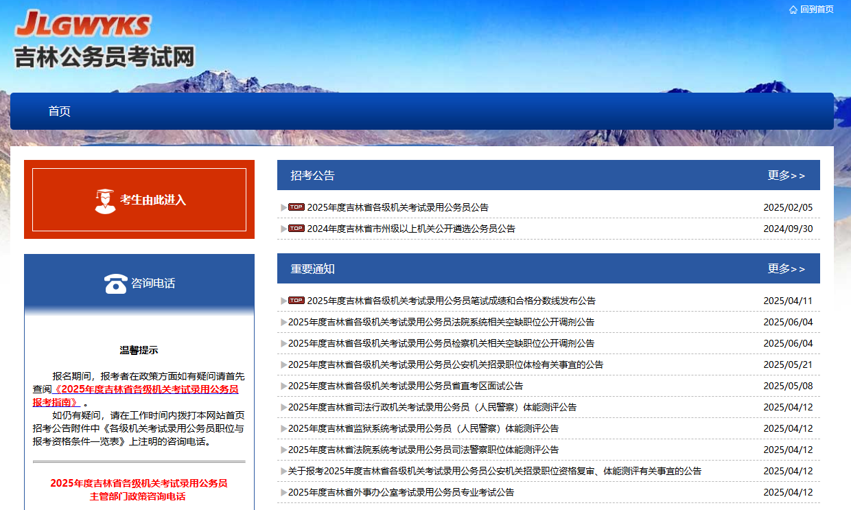 吉林公务员考试网(http://www.jlgwyks.cn),所有报名操作和数据查询均在此网站进行。