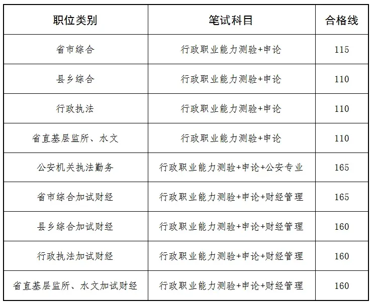 一、笔试合格分数线按职位类别分别划定合格分数线如下:
