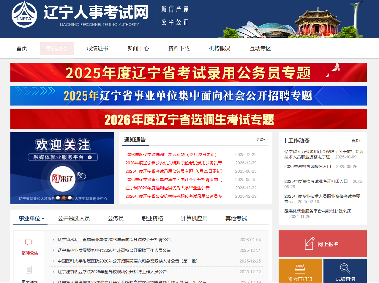 辽宁省公务员考试的官方报名入口是辽宁人事考试网(https://www.lnrsks.com/),考生们需要在规定时间内登录该网站完成报名相关操作。在非报名期间,辽宁人事考试网也会发布辽宁省公务员考试的最新动态、政策解读、备考指导等内容,是大家了解考试资讯的重要平台。考生们可以提前将该网址收藏起来,方便在报名期间快速访问。