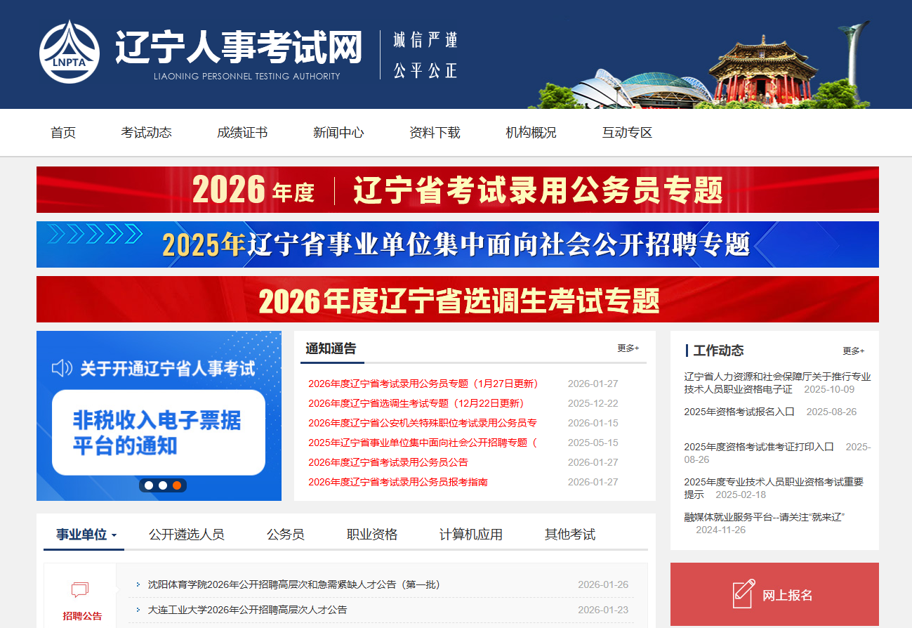 2026年辽宁省公务员考试的报名时间为1月30日9:00-2月3日17:00,报名入口辽宁人事考试网(http://www.lnrsks.com/),考生需在规定时间内登录该网站,点击首页“公务员考试”栏目,选择“2026年度考试录用公务员”专题,即可跳转至报名系统。