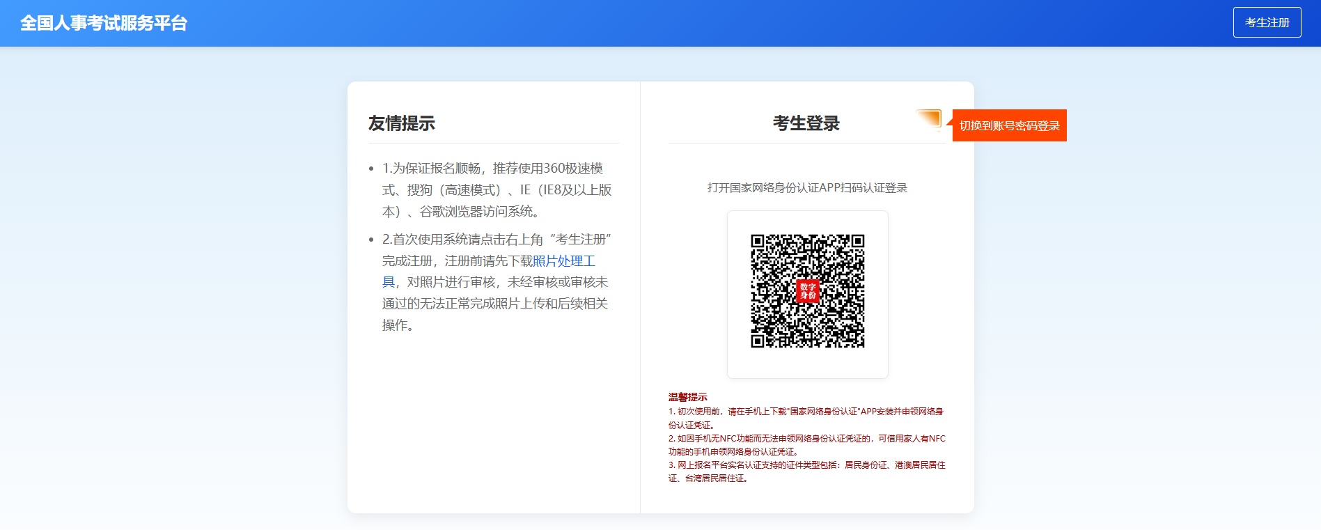 考生在规定时间内登录“全国人事考试服务平台”,使用本人有效居民身份证进行注册,注册成功后登录系统,按要求填写个人信息,包括姓名、身份证号、联系方式、学历学位等,并上传近期2寸蓝底彩色免冠照片。每人限报一个岗位,报考人员应确保信息真实、准确、完整。