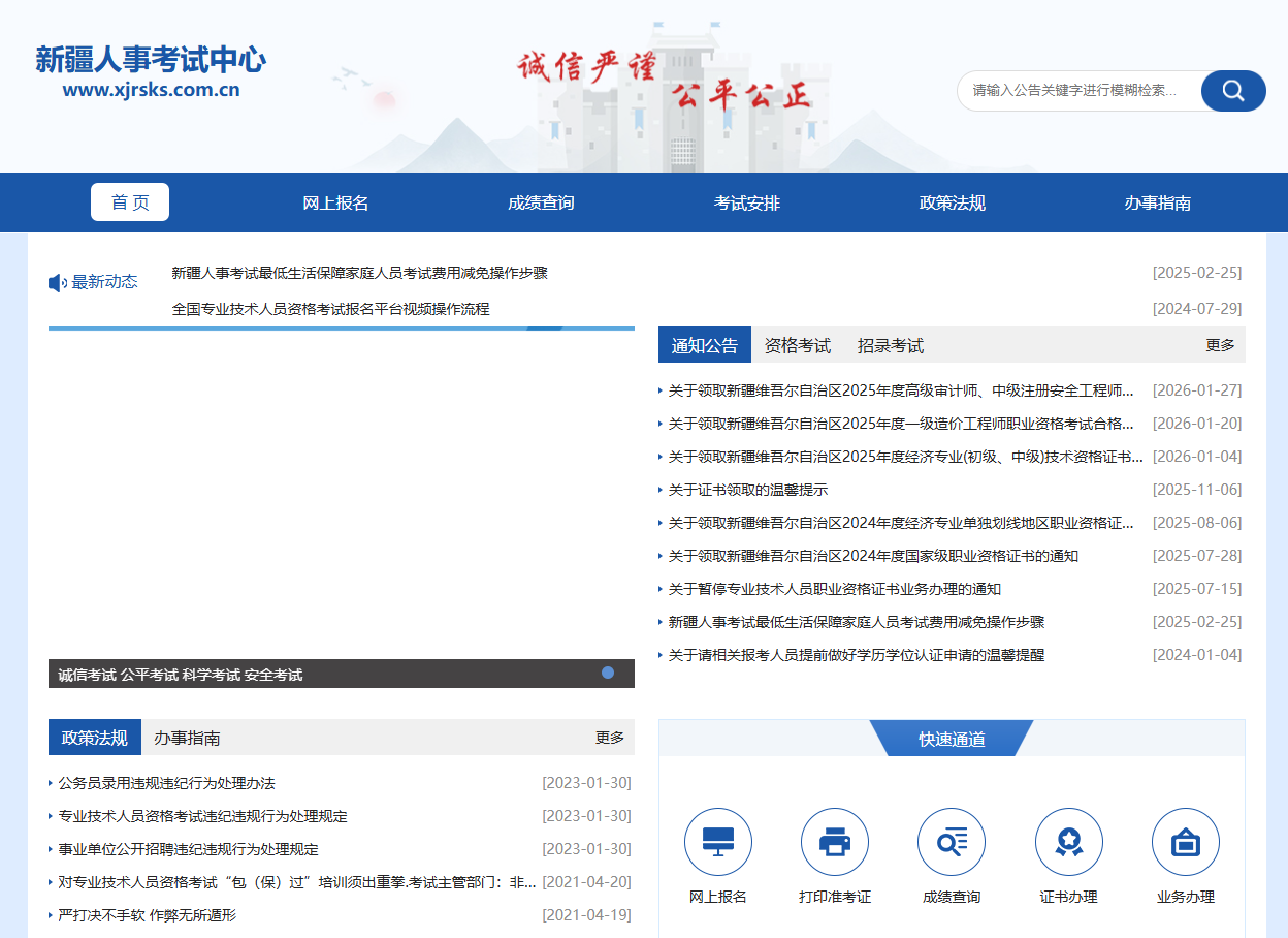 打印入口是新疆人事考试中心网站,网址是https://www.xjrsks.com.cn,这是唯一的官方渠道。考生进入网站后,点击首页的"准考证打印"栏目,选择"2026年上半年事业单位公开招聘分类考试",输入姓名、身份证号、验证码登录后即可下载打印。