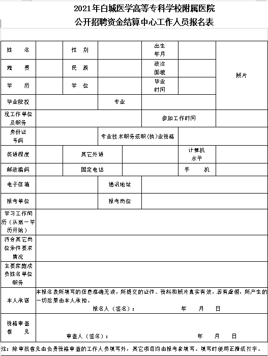 1.《2021年白城医学高等专科学校附属医院公开招聘资金结算中心工作人员报名表》(自行下载填写,见附表1。附本人近期2寸正面免冠照片1张);