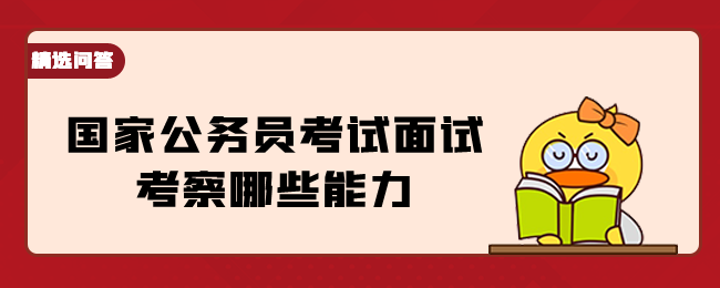 国家公务员考试面试考察考生的组织协调能力、应变能力、综合分析能力、人际交往意识与技巧能力、求职动机与拟任职位匹配性、言语理解与表达能力、自我情绪控制、举止仪表、专业(创新)能力。...