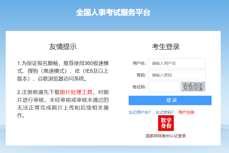 考生需首先访问全国人事考试服务平台,点击“注册”按钮,依据系统指引填写个人基础信息,包括姓名、身份证号、电子邮箱及手机号码等,设置登录密码。注册成功后,通过输入用户名及密码实现登录。