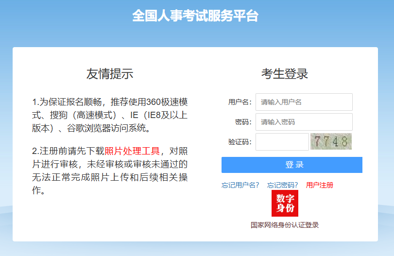 采用网上报名方式,考生需登录全国人事考试服务平台(http://zp.cpta.com.cn)进行报名。