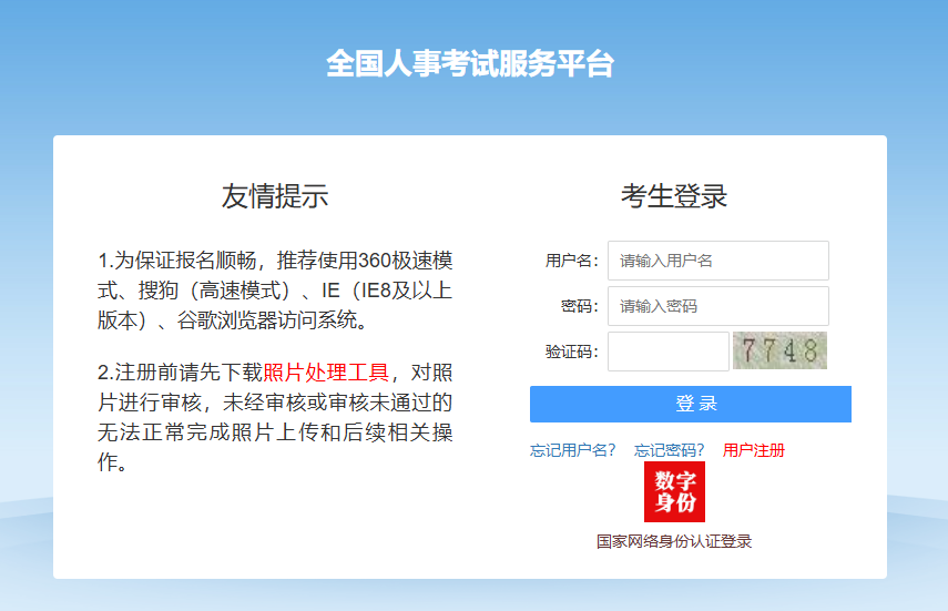 考生需在规定时间内登录全国人事考试服务平台,点击“注册”按钮,填写个人基本信息并设置登录密码。注册成功后,考生可使用用户名和密码登录系统。