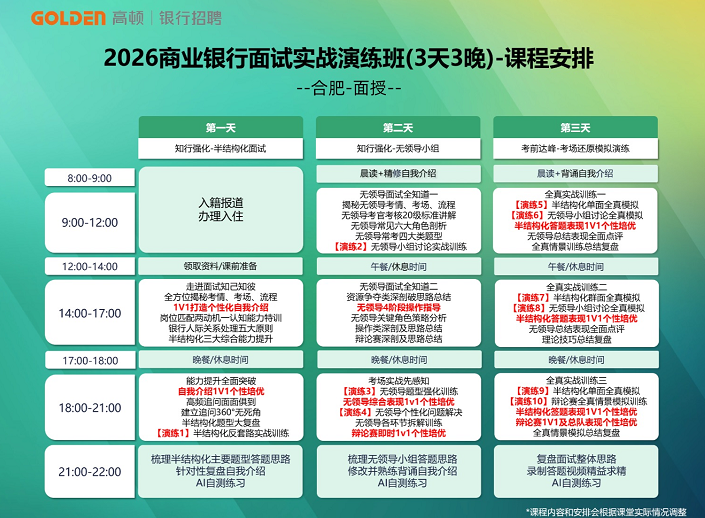 银行招聘现推出2026商业银行面试实战演练班,合肥线下3天3晚包住宿,小班授课,主讲院长自讲自带,多轮全真模拟面试,让学员提前适应考场氛围。面试班还提供协议班与非协议班两种选择,大家可以根据自己的情况灵活选择。