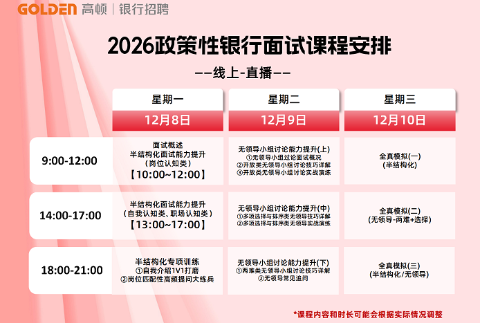 以上就是关于“2026年农发行面试时间最新汇总,附靠谱面试班推荐”的全部内容了,政策性银行校招面试形式多种多样,竞争激烈,参加面试培训,知己知彼百战百胜,详细课程情况可咨询右下角在线老师!