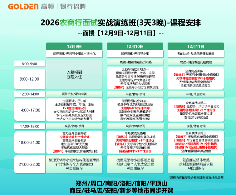 以上就是关于“2026河南农商行面试怎么准备?3天3晚面试实战演练”的全部内容了,面试备考时间比较紧,高顿银行面试班针对性地设计了面试课程,全真模拟演练还原考场,还有专业老师指导,强化你的面试能力,详细课程情况可咨询右下角在线老师!
