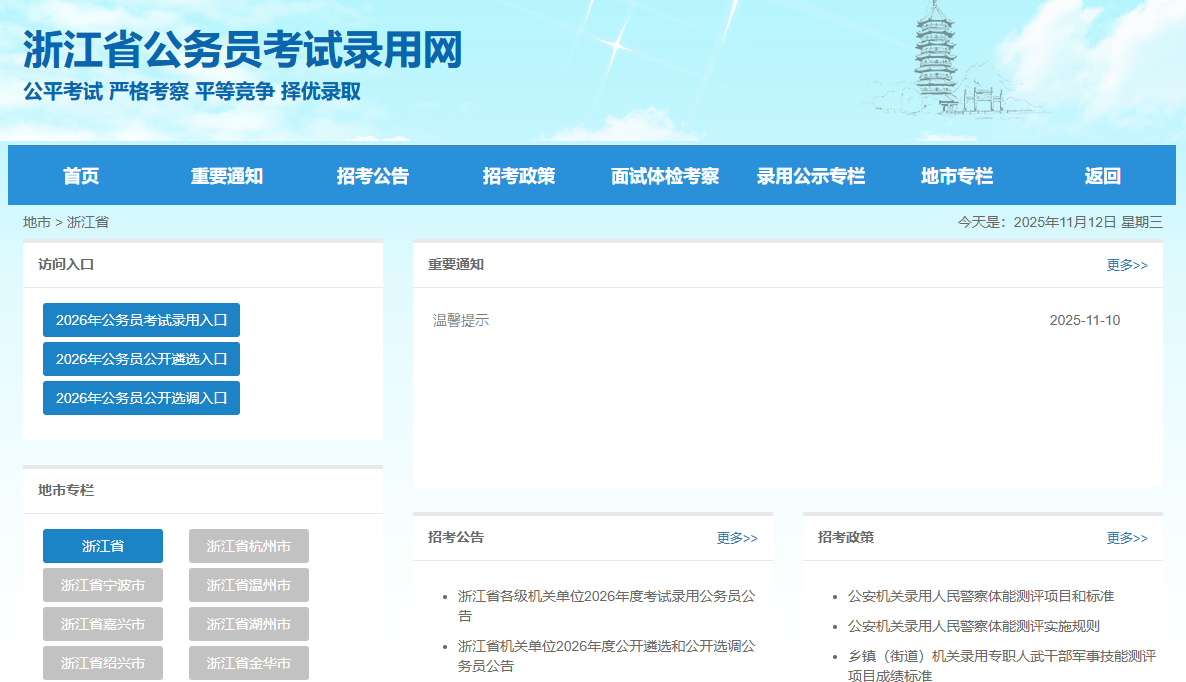 2026年浙江省公务员考试缴费时间是2025年11月14日9时-11月18日17时,考生务必在规定时间内完成缴费,逾期未缴费者视为自动放弃报名资格。
